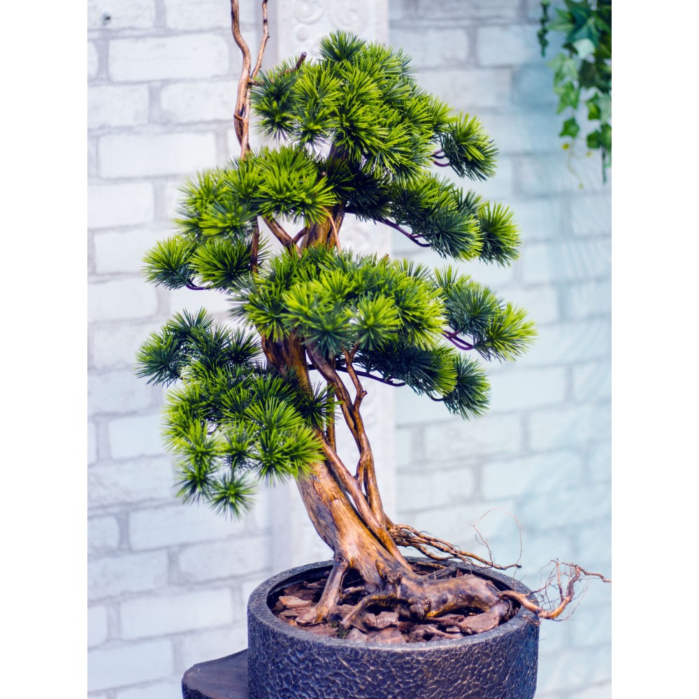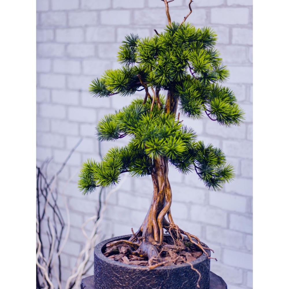 Искусственное дерево Бонсай изготовлено из натуральной деревянной коряги и искусственных сосновых веток хорошего качества.