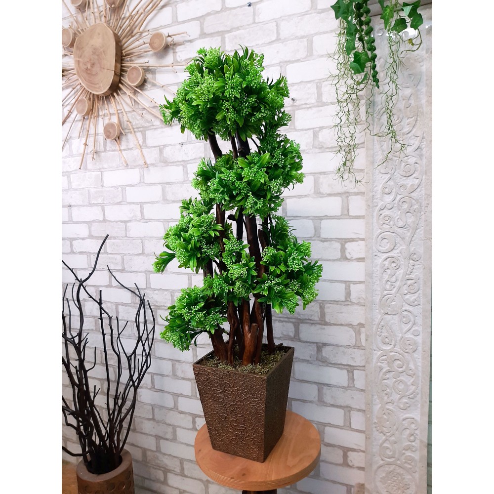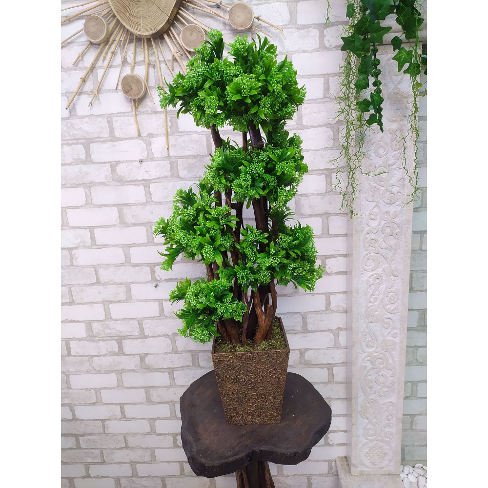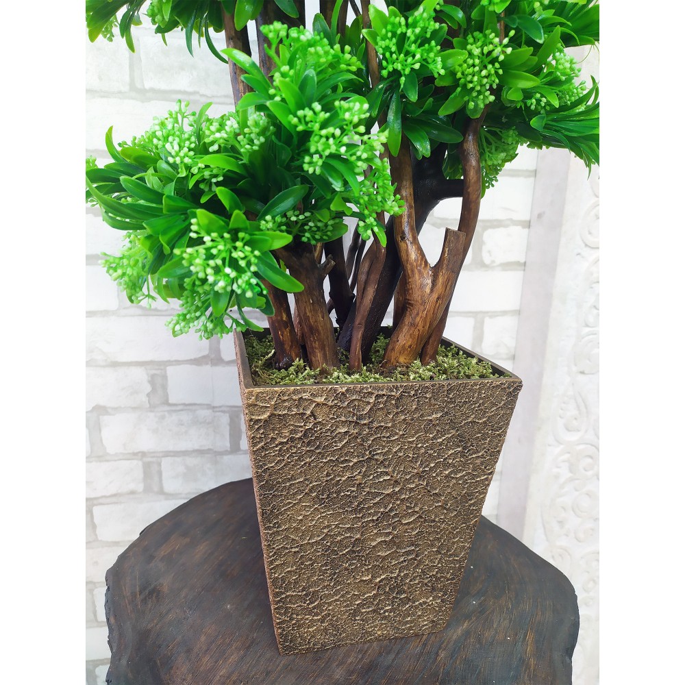 Декоративное дерево бонсай изготовлено из натуральных деревянных веток и искусственных самшитовых листьев.