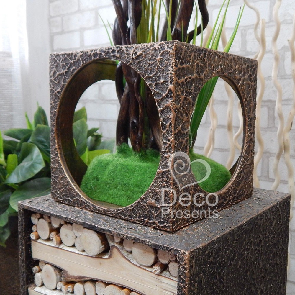 Бонсай выполнен из искусственных материалов, основа - ветки из натурального дерева, а завершает композицию пластиковый вазон с необычным дизайном.