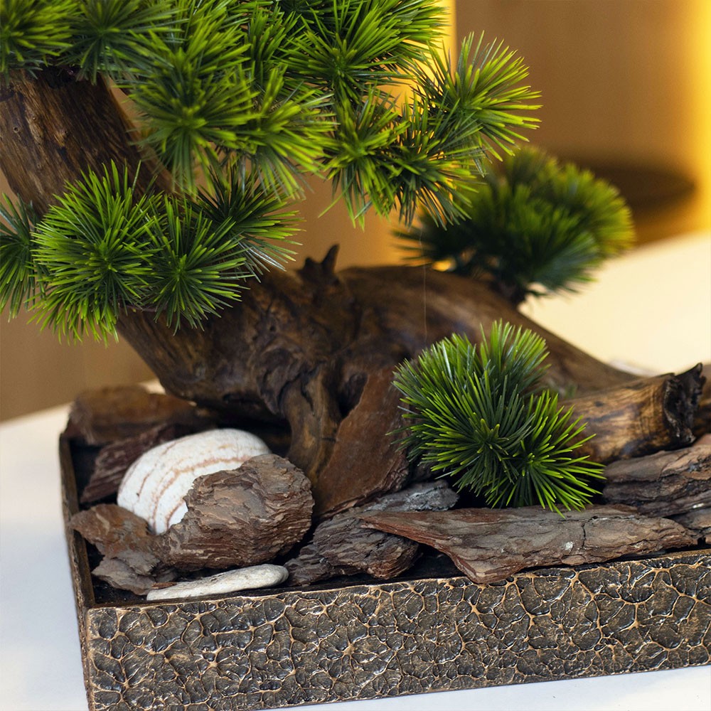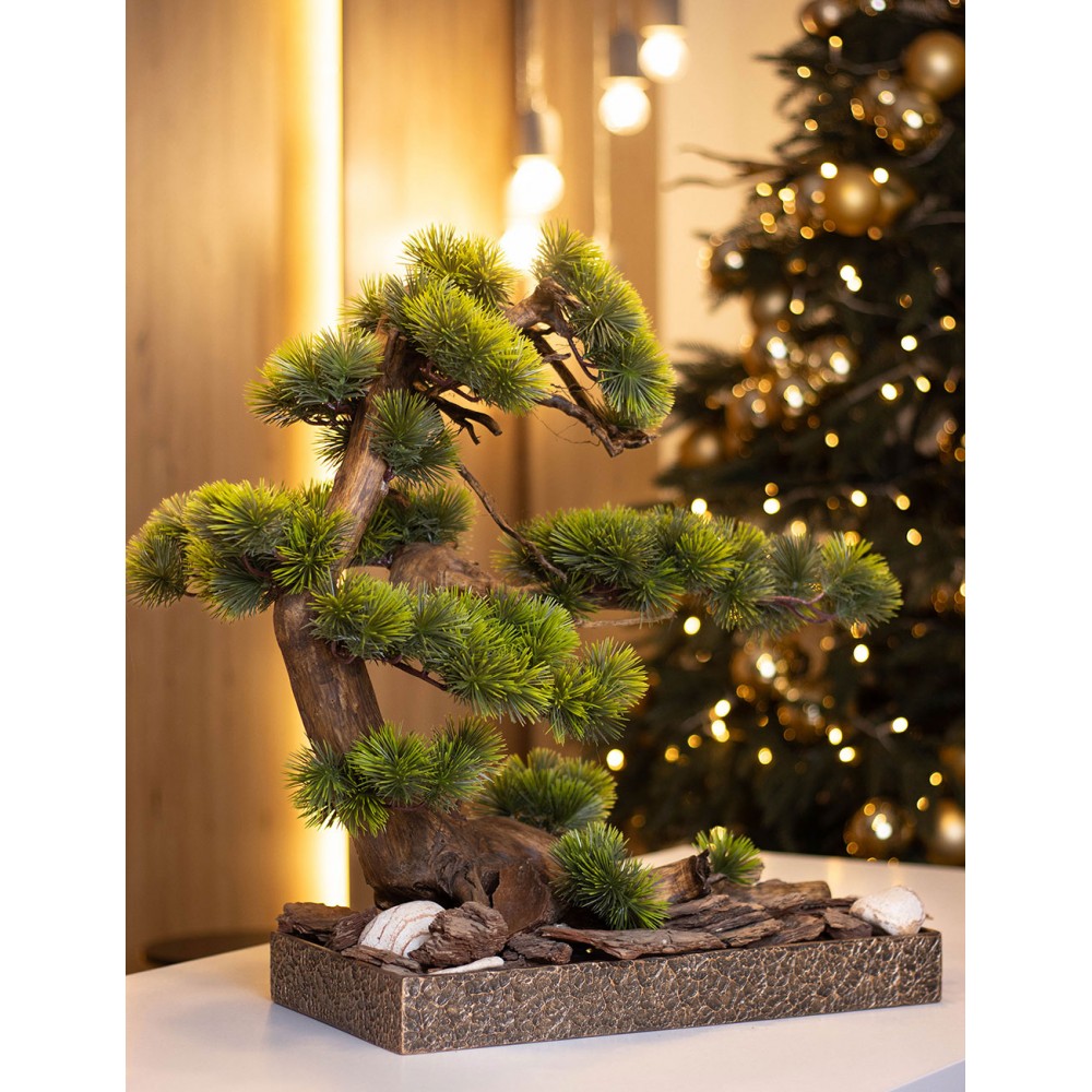 Искусственное дерево Бонсай изготовлено из натуральной деревянной коряги и искусственных сосновых веток хорошего качества.