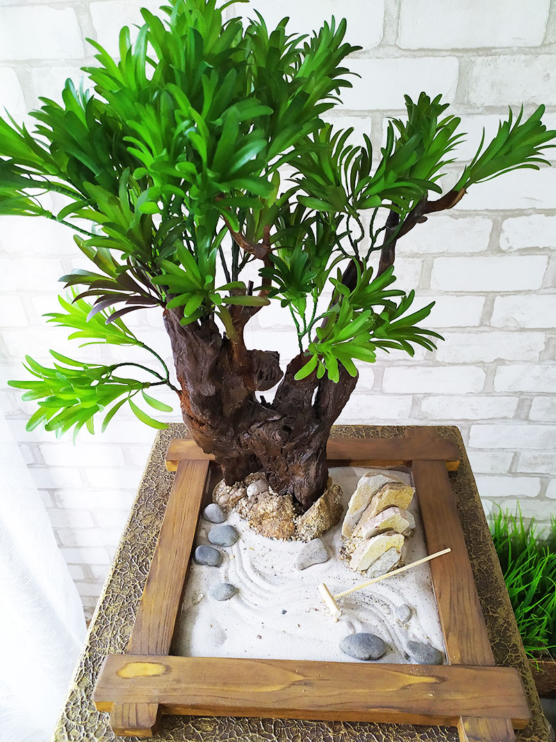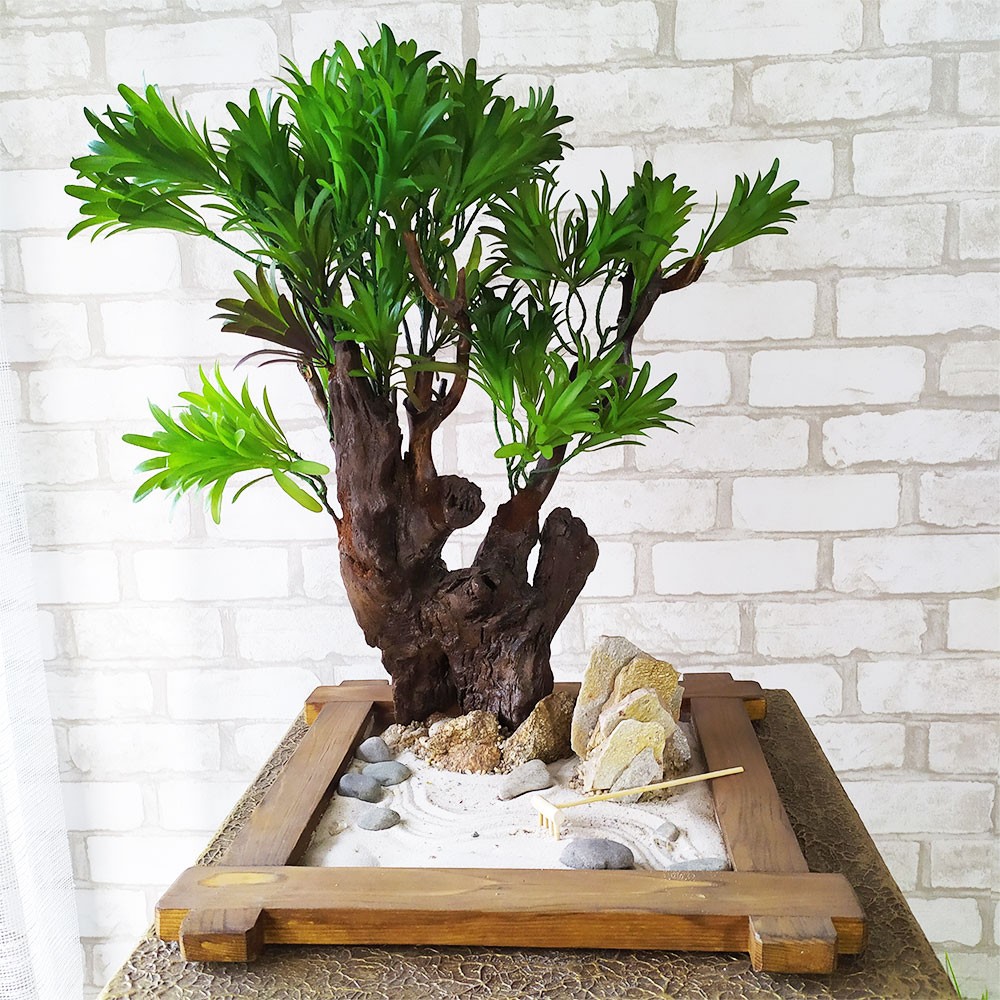 Дзен настольный сад камней, подарочная версия для офиса. Полностью ручная работа. Для дерева использовано 3 ветки искусственной зелени. В наборе также прилагается декоративная подставка из дерева, набор мелких природных камней, натуральный кварцевый песок.
