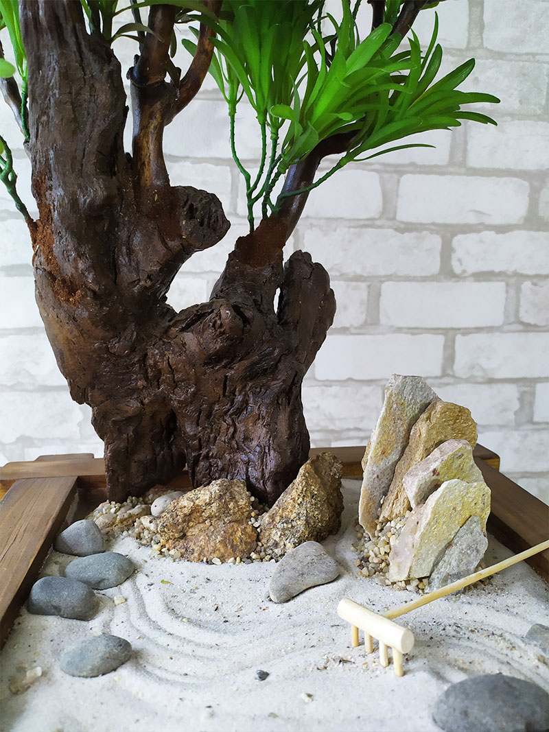 Материалы: дерево, песок, природные камни, галька, натуральный корень дерева, искусственные листья (пластик).