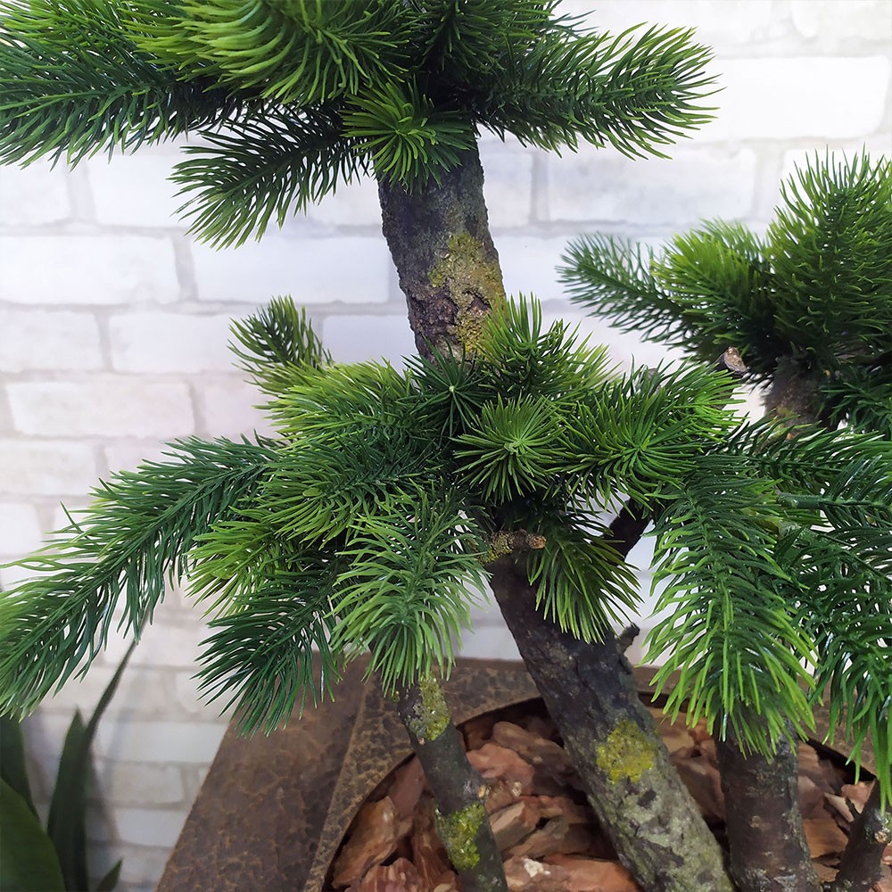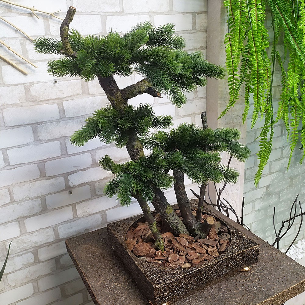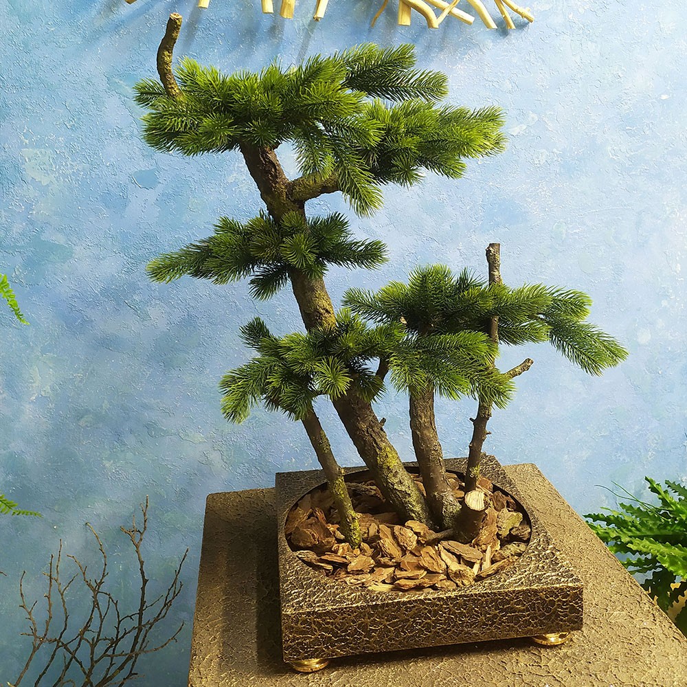 Искусственное декоративное дерево Бонсай изготовлено из натуральной деревянной коряги и искусственных сосновых веток. Коряга установлена в декоративный вазон размером 30х30 см.