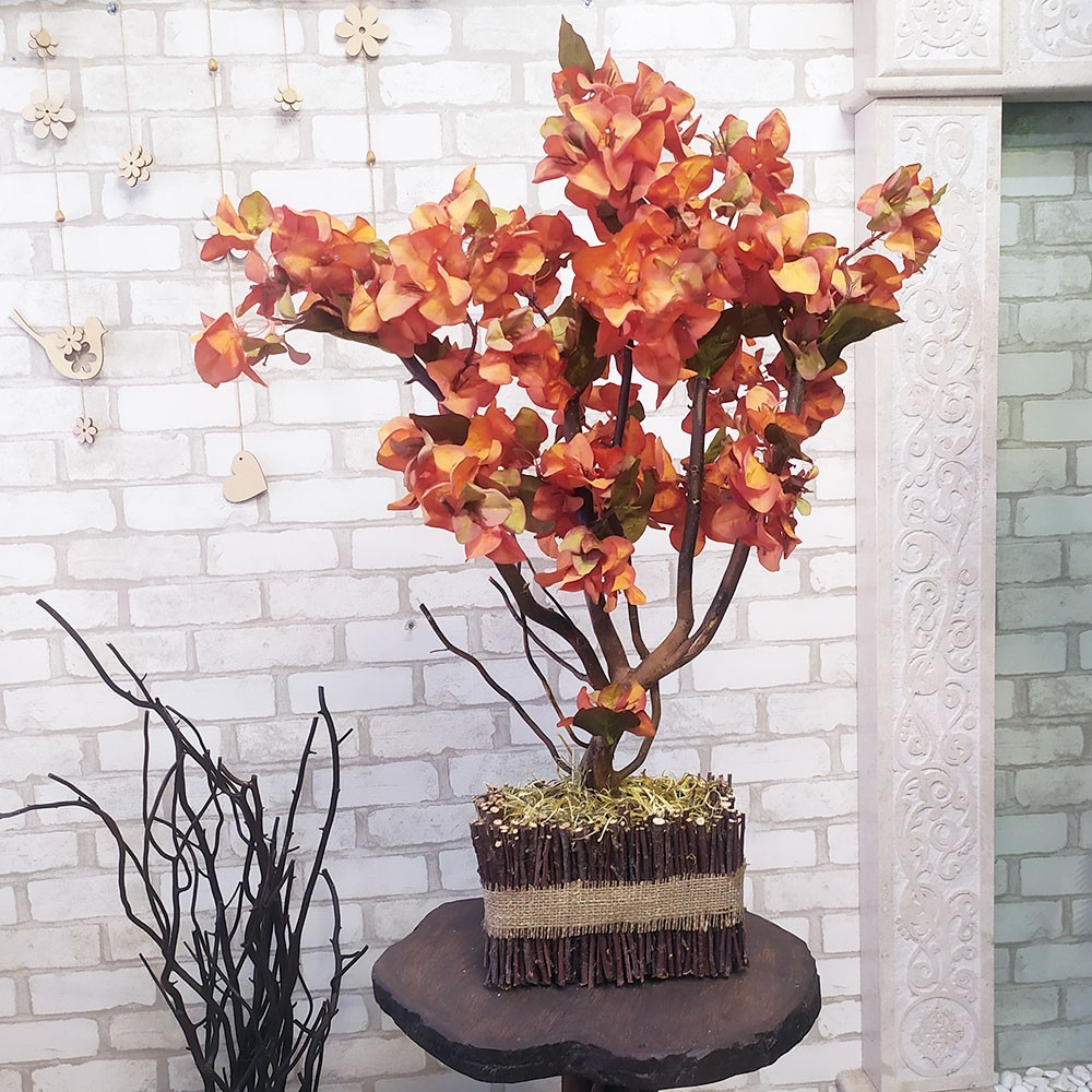 Осенний декор дерево бонсай. Используются натуральные деревянные ветки и искусственные листья оранжевого цвета. Дерево установлено в декоративное кашпо из природных веток.