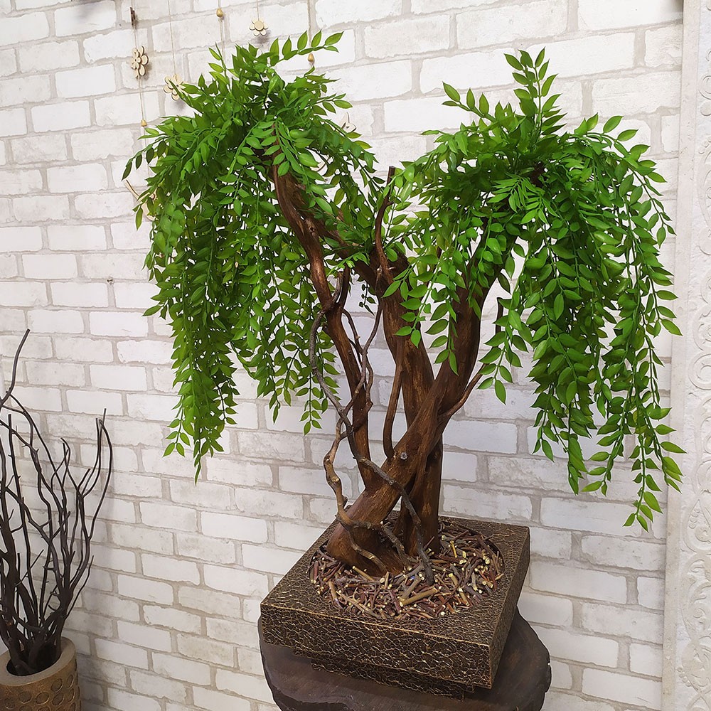 Декоративное дерево изготовлено с применением натуральных деревянных веток, покрученной формы, к которым приклеены искусственные листья, похожие на иву. Материал листьев - пластик.