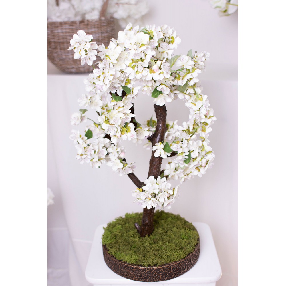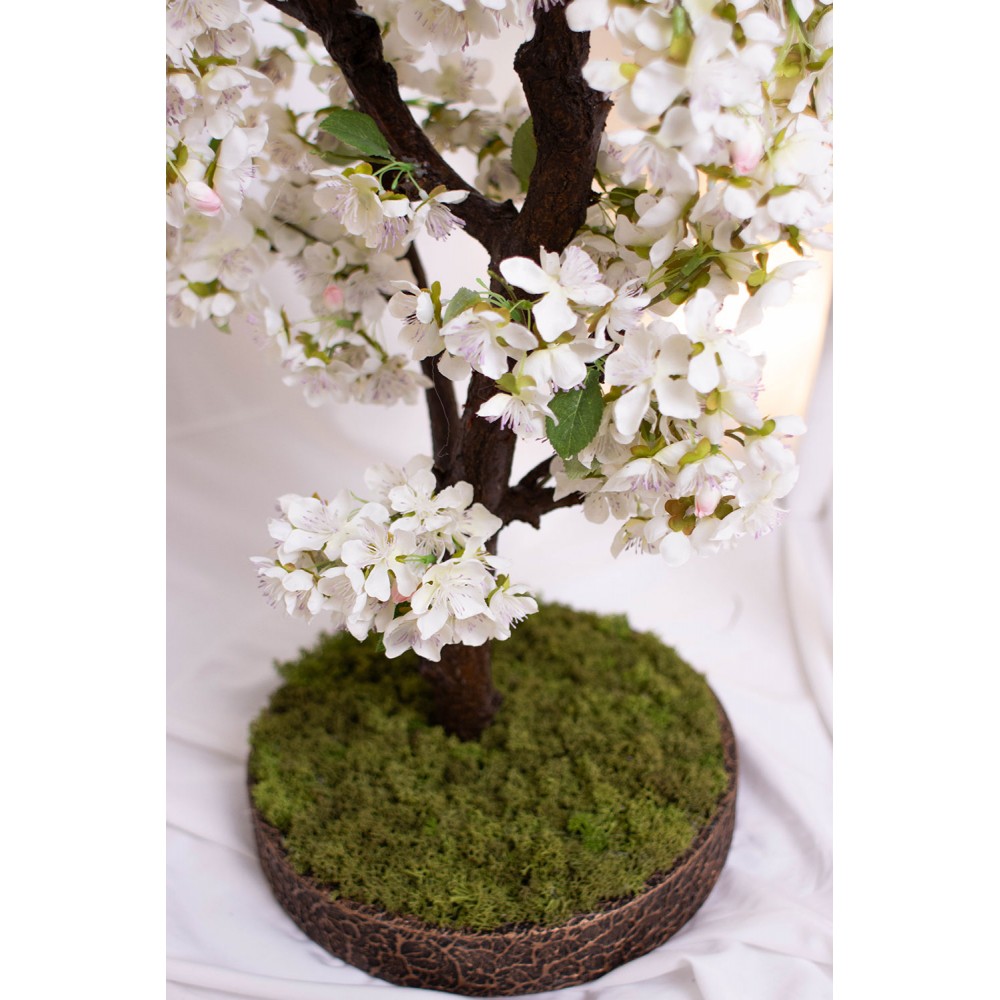 Декоративная цветущая сакура изготовлена из натурального деревянного ствола и искусственных веток с белыми цветами. Дерево установлено в декоративный вазон круглой формы, оформленный натуральным стабилизированным мхом зеленого цвета.