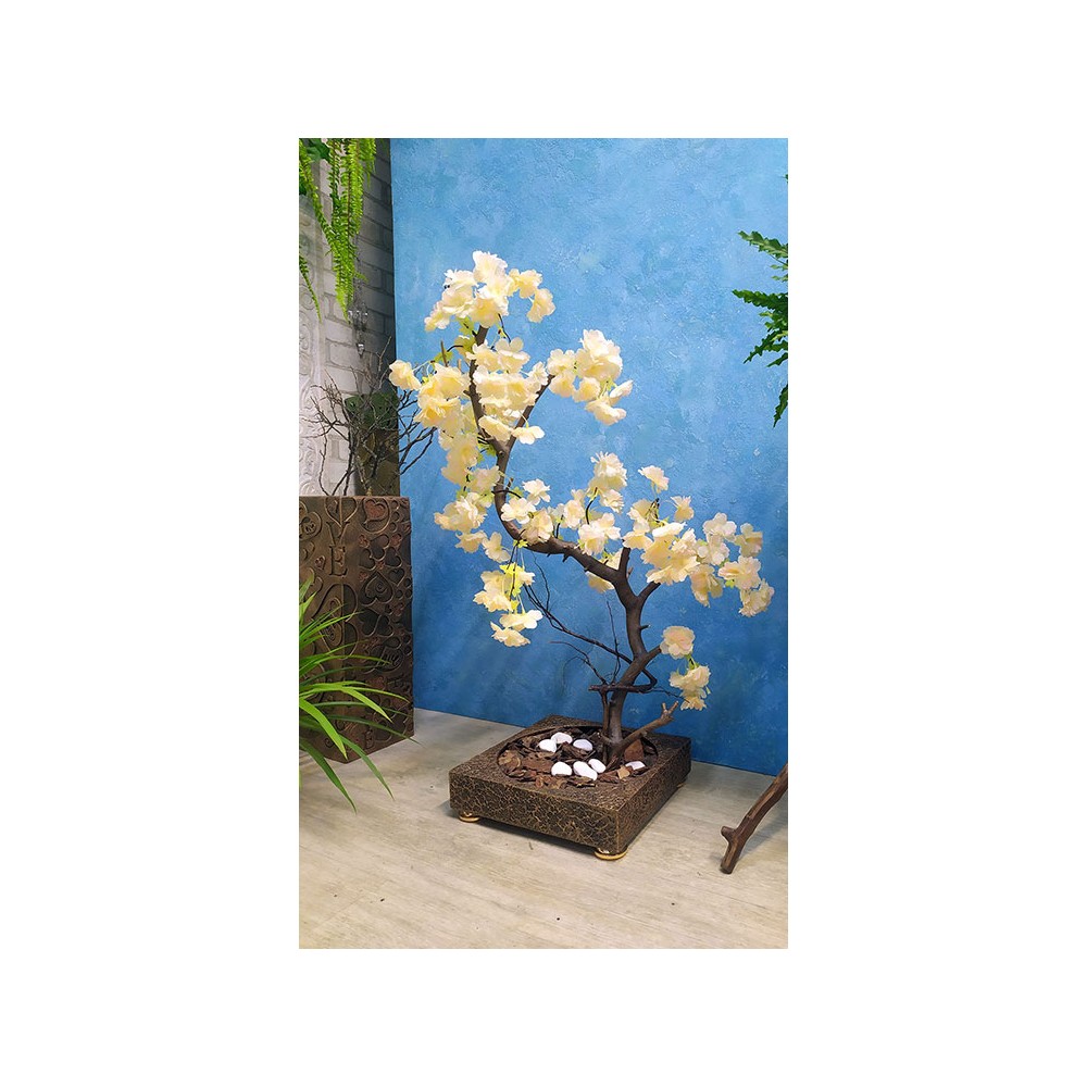 Декоративная цветущая сакура изготовлена из натурального деревянного ствола и искусственных цветов. Дерево установлено в декоративный вазон прямоугольной формы, оформленный натуральной деревянной корой