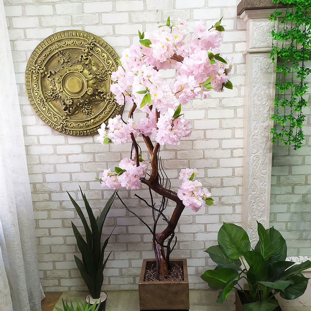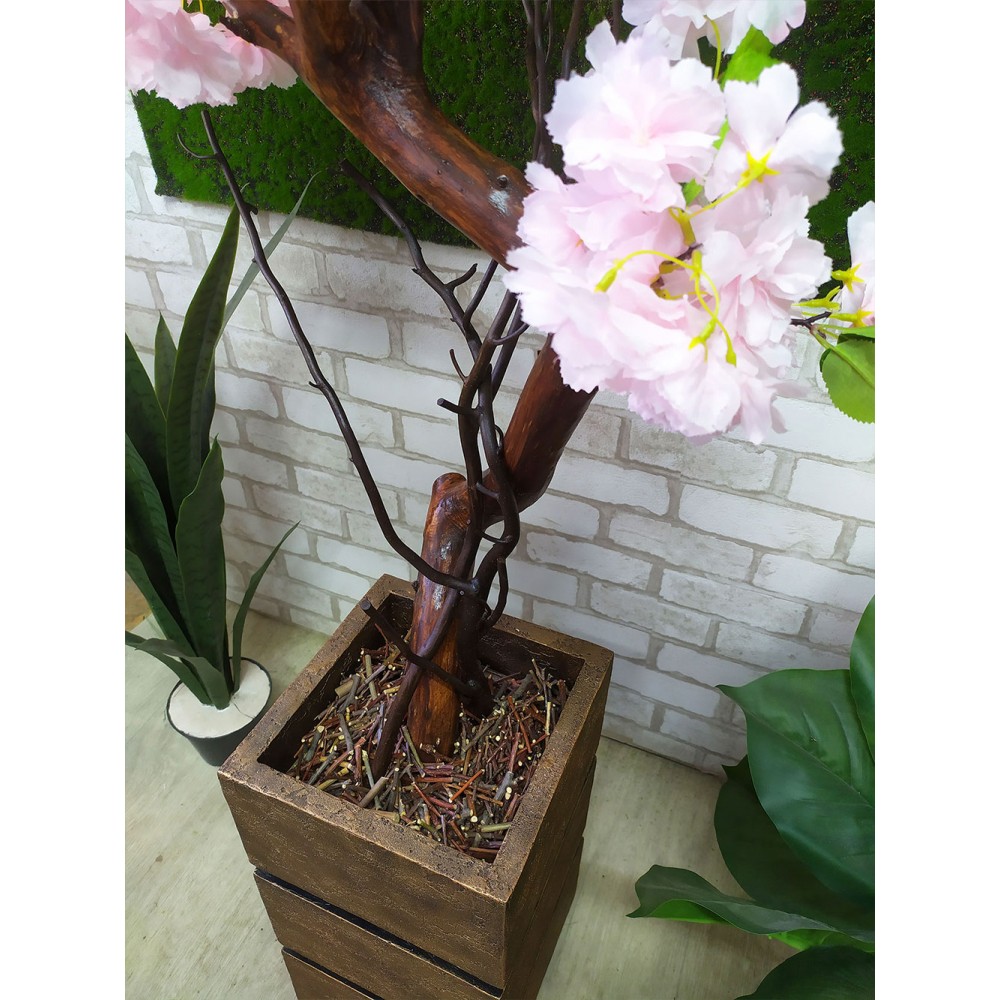 Декоративная цветущая сакура изготовлена из натурального деревянного ствола и искусственных цветов. Дерево можно установить в декоративный вазон прямоугольной формы