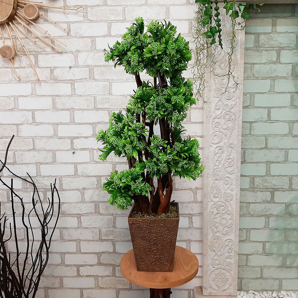 Декоративное дерево бонсай изготовлено из натуральных деревянных веток и искусственных самшитовых листьев.