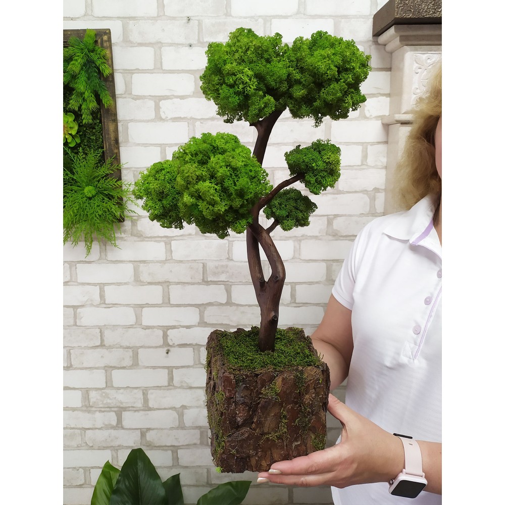 Бонсай зі стабілізованого моху стане чудовою прикрасою інтер'єру, елегантним декором у вас вдома, та на робочому місці. Дерево встановлено декоративний горщик, який декорований натуральною корою. Крона дерева зроблена з оленячого моху зеленого кольору, який дуже м'який, ніжний та пружний.