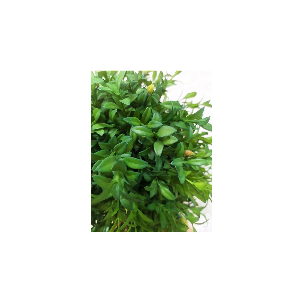 Настільне декоративне дерево виготовлено з натуральних дерев'яних гілок та штучного листя зеленого самшиту. Бонсай встановлений у декоративний горщик із декором із природного засушеного моху та натуральних соснових шишок.
