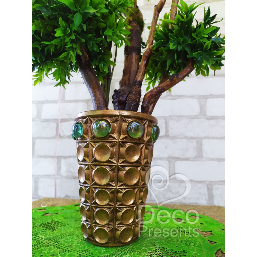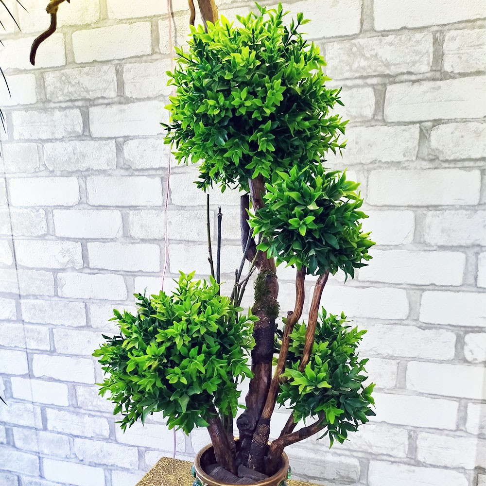Настільне декоративне дерево виготовлено з натуральних дерев'яних гілок та штучного листя зеленого самшиту. Бонсай встановлений у декоративний горщик із декором зі скляних камінців