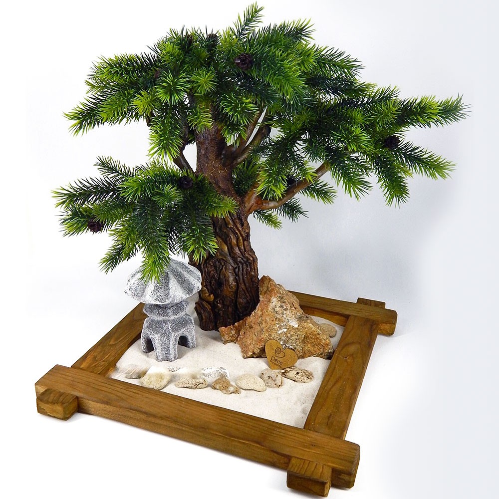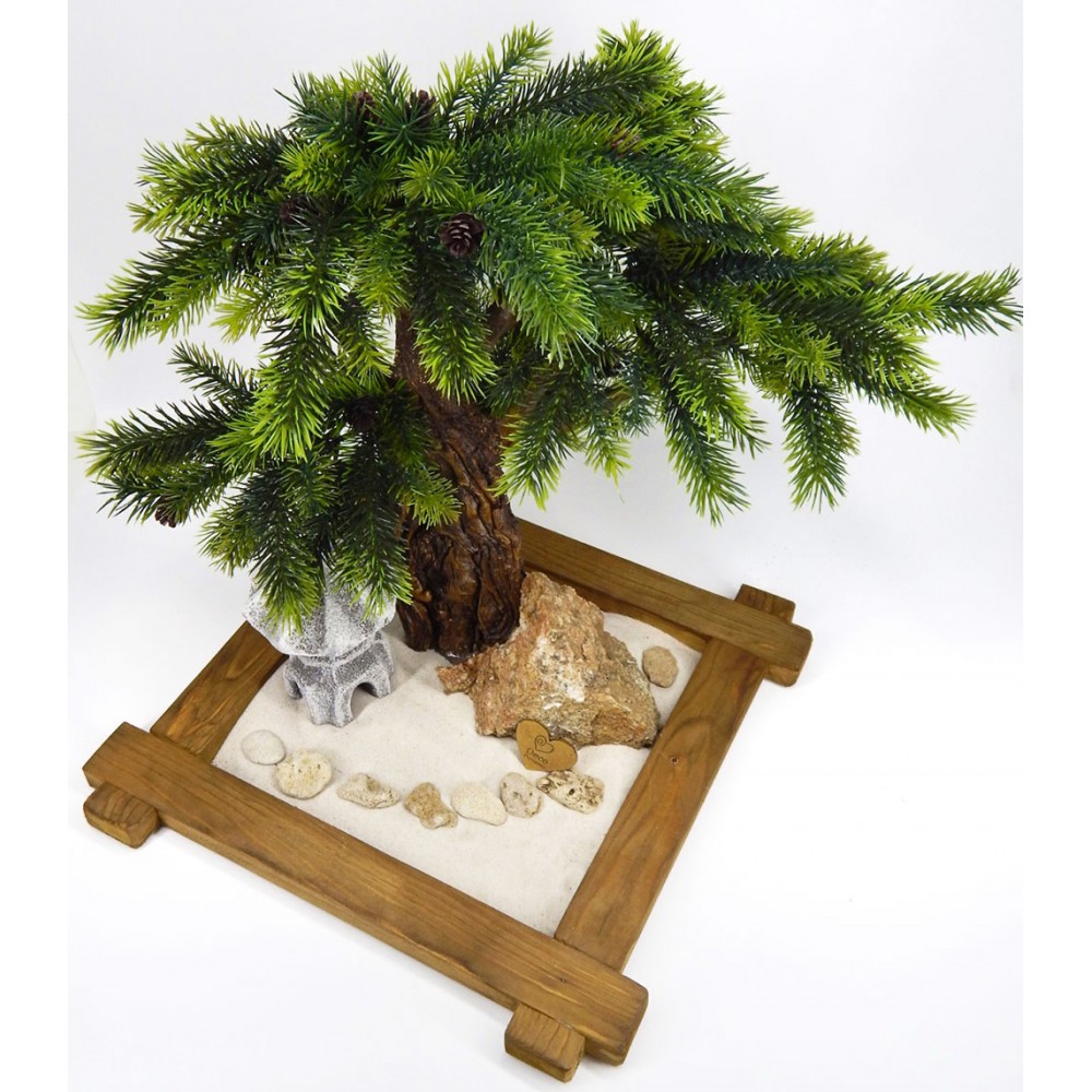Справжній настільний сад виготовлений з натурального каміння різних видів. Основою є дерев'яна рама, покрита лаком.