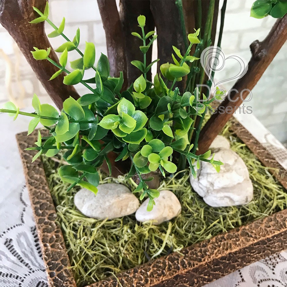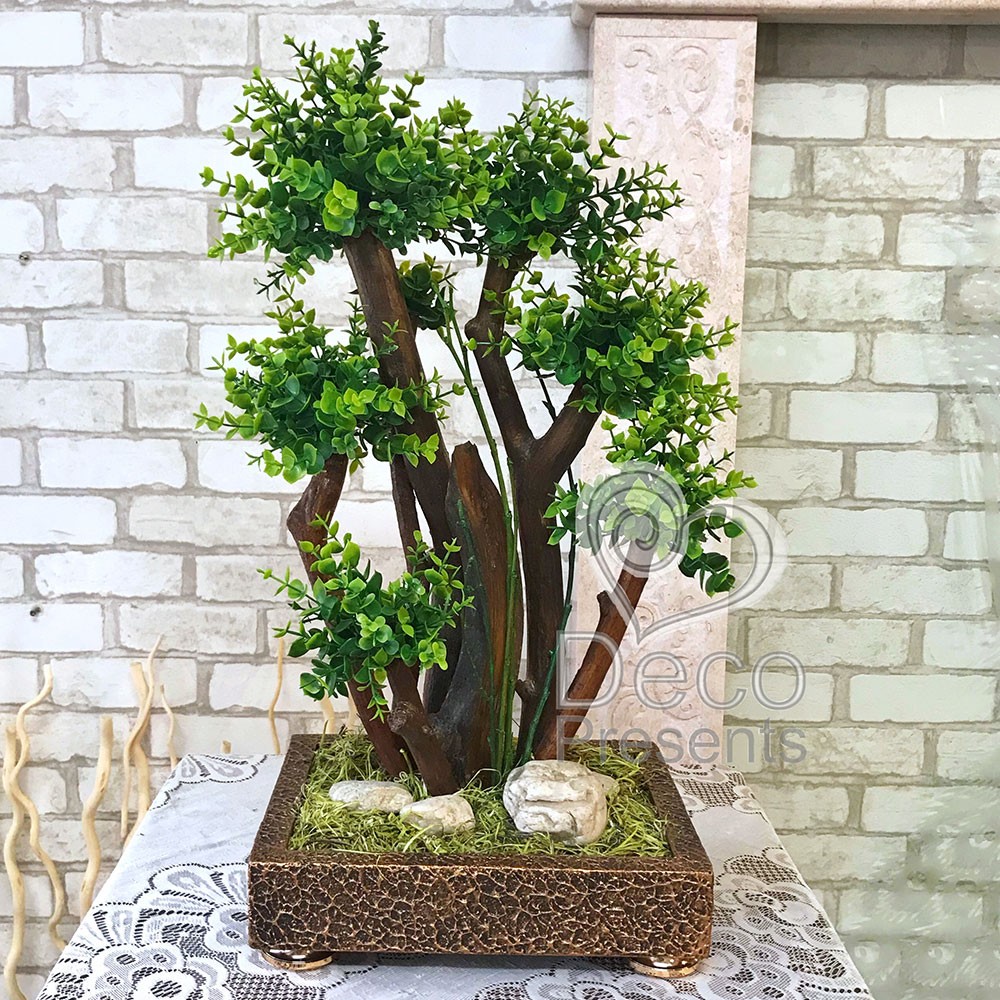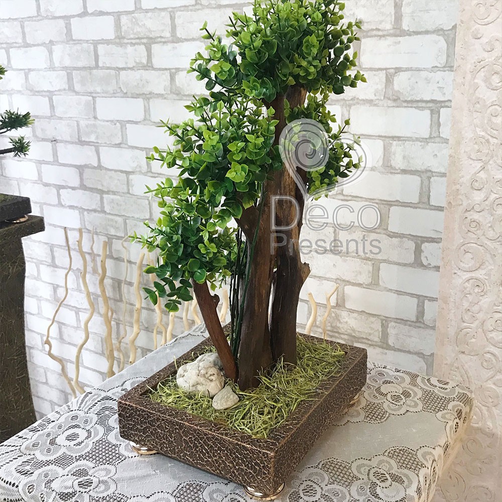 Штучний декоративний бонсай виготовлений з натуральних дерев'яних гілок та штучних гілочок Самшита. Використано 5 штучних самшитових гілок гарної якості.
