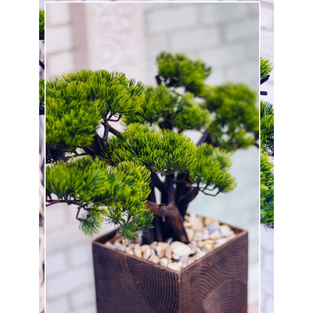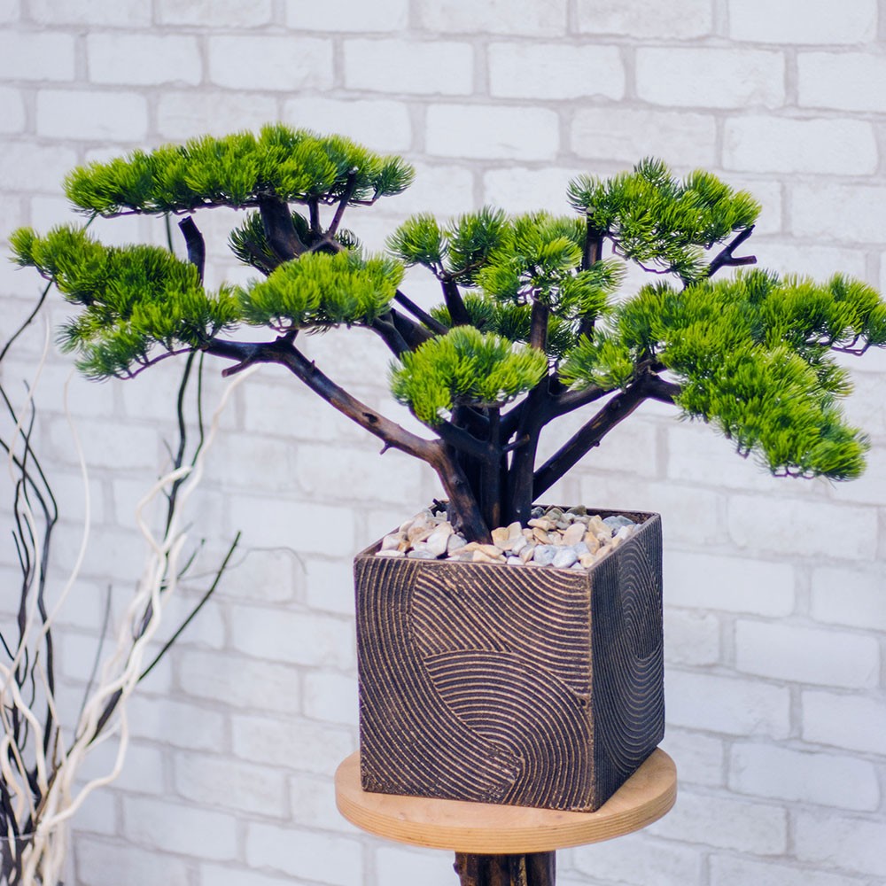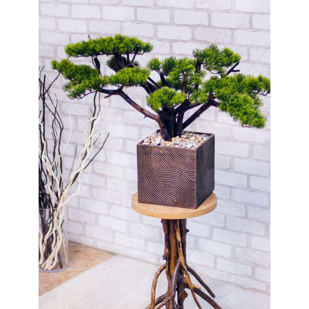 Штучне декоративне дерево Бонсай виготовлено з натуральної дерев'яної корчі та штучних соснових гілок. Корчя встановлена у прямокутний декоративний вазон.
