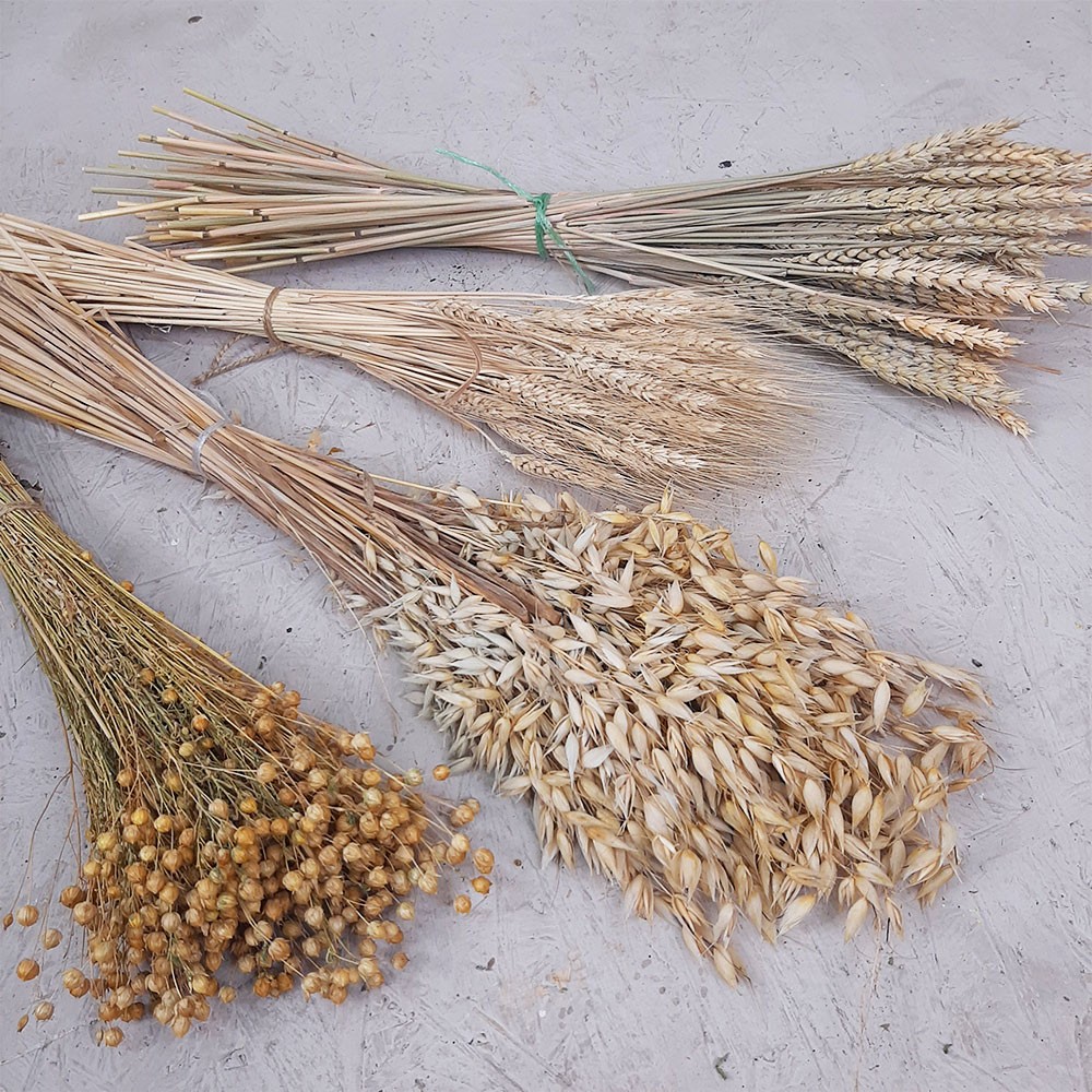 Набір складається з чотирьох букетів натуральних колосків. Засушені колоски можна використовувати для створення красивих букетів із сухоцвітів, для композицій у вазах або для оформлення інтер'єру.